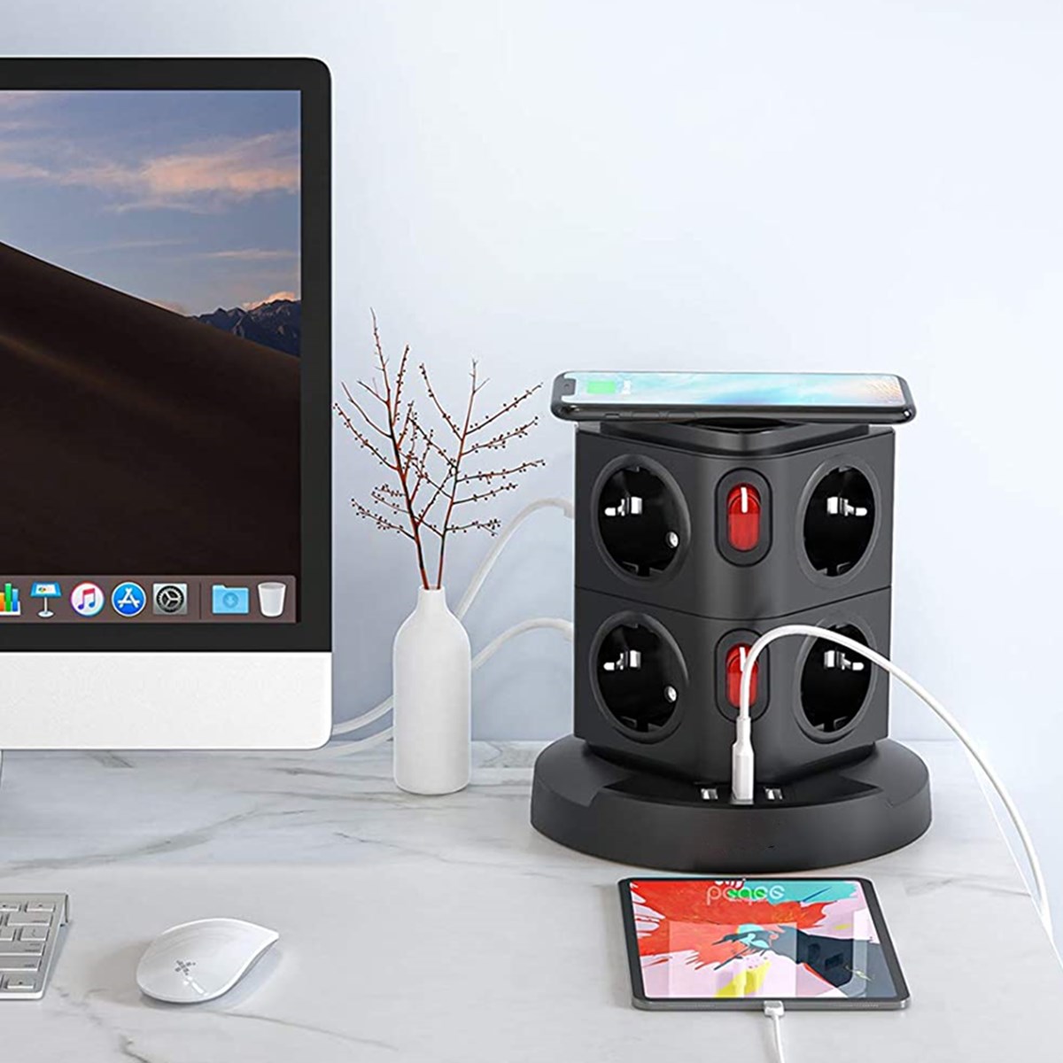 Çalışma alanınızdaki enerji karmaşasına profesyonel bir son verin. Protech PS-8, kule tipi tasarımıyla masanızda yer tasarrufu sağlarken, en üst yüzeyindeki entegre kablosuz şarj ünitesiyle mobil cihazlarınıza zahmetsiz enerji sunar. Gücü estetikle buluşturan teknolojik bir üs.